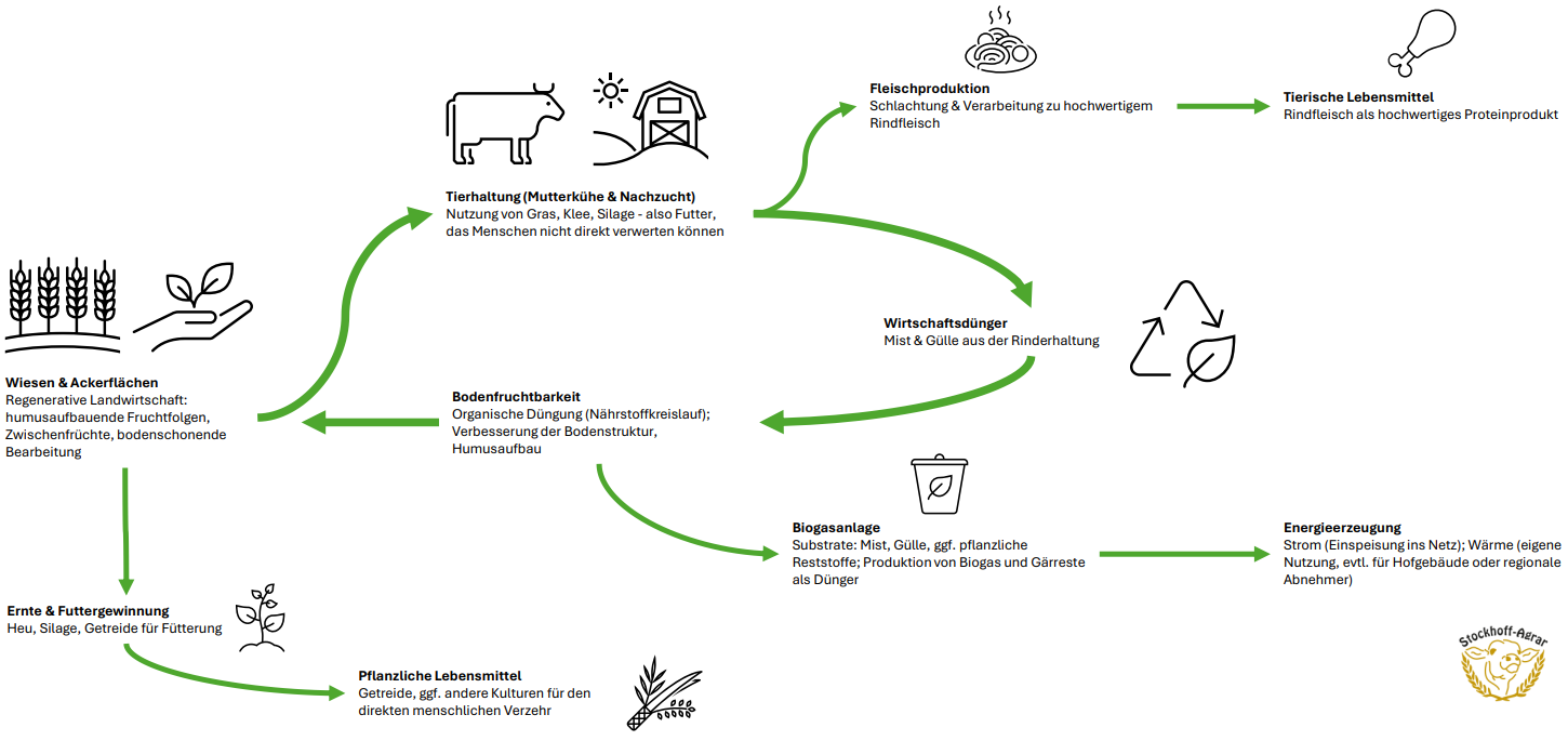 Im Mittelpunkt der betrieblichen Ausrichtung steht die Kreislaufwirtschaft: Futterpflanzen und pflanzliche Nebenprodukte dienen der Fütterung der Rinder, während organischer Dünger aus der Tierhaltung zurück auf die Felder gelangt. Auf diese Weise wird ein natürlicher Nährstoffkreislauf erzeugt, der langfristig Bodenfruchtbarkeit und Pflanzengesundheit erhält.